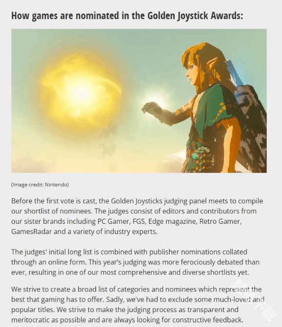 在今年的金摇杆奖投票页面上,Gamesradar在文章末尾提到:在第一轮投票开始之前,金摇杆奖的评审团将会举行会议来确定我们的提名名单。评审团成员包括来自我们姊妹品牌的编辑和撰稿人,如PC Gamer(评分87分)、Edge magazine(评分60分)、GamesRadar(评分80分)、FGS、Retro Gamer等,以及众多行业专家。