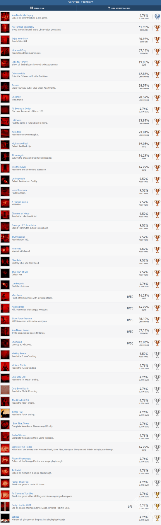 寂静岭2:重制版的发售在即,与此同时PS5平台上的奖杯列表也已公开,包括1个白金奖杯、3个黄金奖杯、12个白银奖杯和28个铜奖杯,共计44个奖杯。据外国媒体报道,为了全奖杯玩家可能需要多次进行游戏,整个过程可能需要完成的游玩六到七遍。