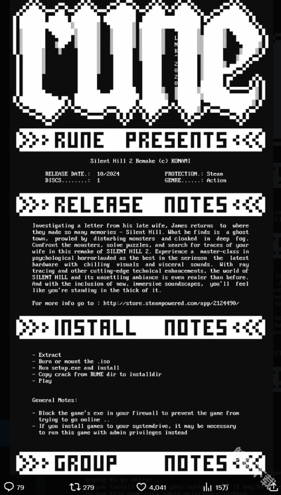 寂静岭2重制版将在今天(10月8日)正式发布,但是游戏在发布之初已经被提前破解。这是因为之前购买寂静岭2重制版豪华版的可以提前2天进行游玩,但是有一部分技术出色的玩家已经将游戏破解出来了,主要还是因为这款游戏没有D加密导致的。