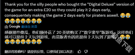 还有玩家把这个锅甩给了可以提前2天游玩的豪华版,并表示:“玩家额外支付了一笔可以提前玩的费用,所以才买了豪华版的游戏,所以盗版的作者也因此从中获利,提前2天就开始了游戏的破解,并发布到网络上。”