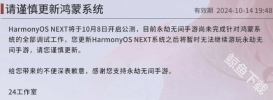 这一次永劫无间手游官方表示需要谨慎更新鸿蒙系统,目前游戏还没完成针对鸿蒙系统的全部调试工作,如果更新了HarmonyOS NEXT鸿蒙系统可能会导致玩家暂时无法正常游玩到这款游戏。