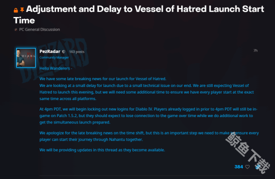 目前暗黑破坏神4DLC憎恨之躯已经正式发布解锁,在经过过一小段推迟发布后,最近暗黑破坏神4官方也是在公告中向期待已久的玩家们致歉,并表示DLC因技术的问题导致的推迟发布。