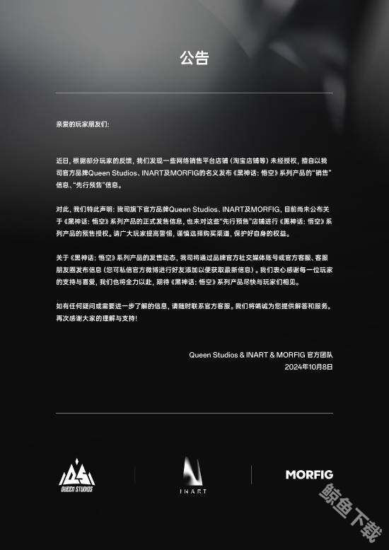 最近就有部分黑神话玩家反映在一些网络销售平台上有一些未经授权的商品,黑神话悟空官方手办工作室INART就急忙发布了声明,并提醒广大玩家黑神话系列产品还未经证实发售和公开,玩家们需要警惕网络上一些商家没有授权的提前预售。