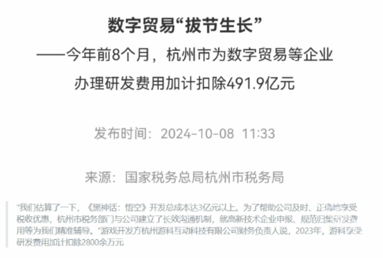 最近由杭州税务局发布的文章中公布了黑神话悟空的开发总成本花费了3亿多元,这个消息一进发布就引起了玩家们广泛的讨论,都感叹游科通过黑神话悟空拉动了各行各业的经济收益,回报率直接拉满了。
