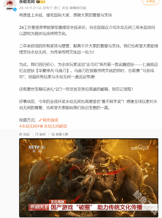 就在最近永劫无间发文表示感谢受邀央视的采访,并想广大玩家和全国的观众们介绍了这款游戏如何助力文化传播的。同时金摇杆官方也宣布了永劫无间提名爱不释手奖,并为全体玩家送出“金乌纪”系列第一款武器皮肤-匕首极品纪念皮肤【华夏神兵·马首刀】。