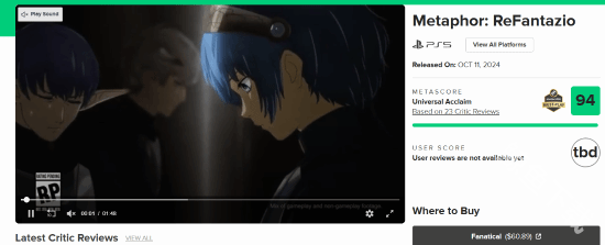 ATLUS官方在文章中写到:“在本周发布的海外游戏评分网站M站上,暗喻幻想:ReFantazio在Xbox上获得了92分,Windows/Steam版91分,PlayStation5版94分(最高分)的好成绩。目前已经是2024年度发布所有作品中的最高分了,这款游戏也终于在本周的10月11日正式发布了,非常感谢!”