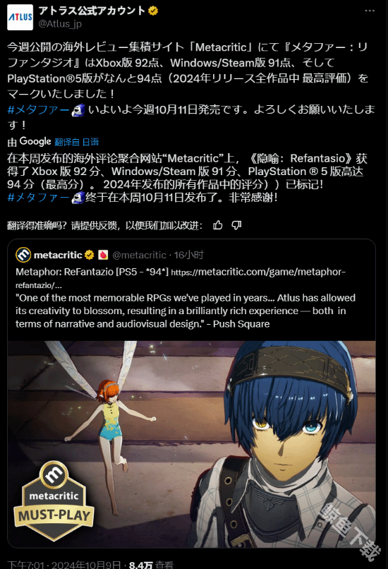 ATLUS旗下最新的作品-暗喻幻想:ReFantazio,这是一款幻想风格的RPG游戏,将于今天(10月11日)正式全面发售。目前这款游戏PS5版在M站的媒体均分高达94分,受到游戏行业和媒体的一致好评。最近ATLUS官方也是发文致谢,庆祝这款新游获得M站高分。