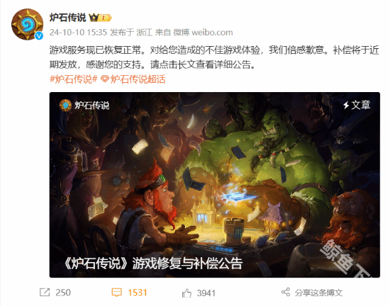 之前炉石传说国服回归以后各种问题以及BUG层出不穷官方宣布会及时维护,就在昨天炉石传说官方宣布自9月25日国服回归以来游戏中出现的问题目前已经全部修复,游戏服务也恢复到正常状态,并将在最近通过补偿的方式来回馈玩家们。