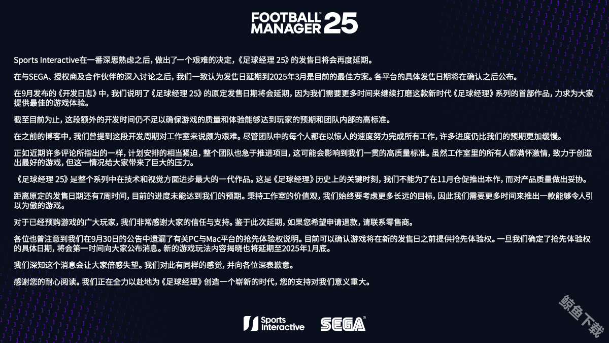 《足球经理25》是整个系列中在技术和视觉方面进步最大的一代作品。这是《足球经理》历史上的关键时刻,我们不能为了在11月仓促推出本作,而对产品质量做出妥协。