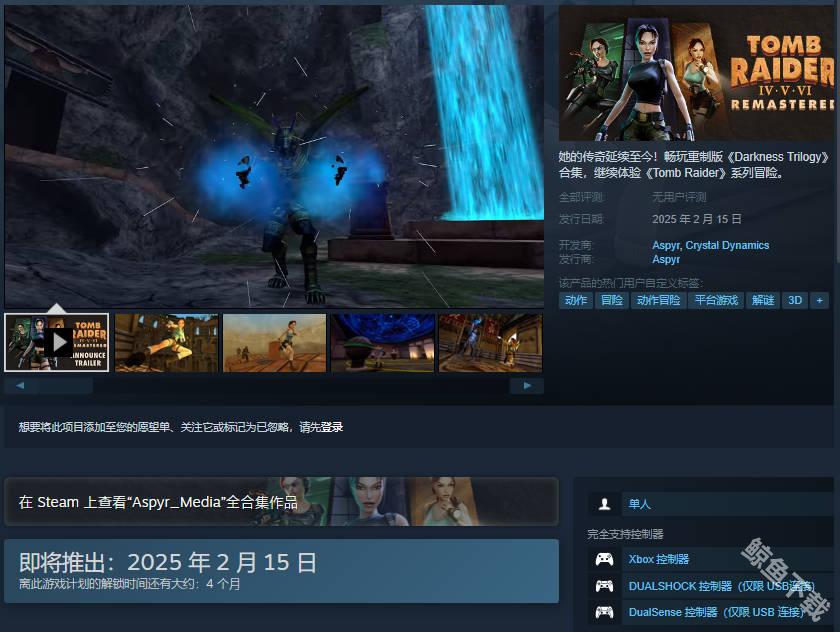 Aspyr正式公布旗下的经典之作古墓丽影4-6复刻版(Tomb Raider IV-VI Remastered)将在2025年2月15日发售,游戏同步登陆NS/PC/PS4/PS5/XSX|S平台。目前这款游戏已经在steam平台商店正式上线了,游戏支持简体中文,售价为108元,但有优惠活动,折后97.2元。