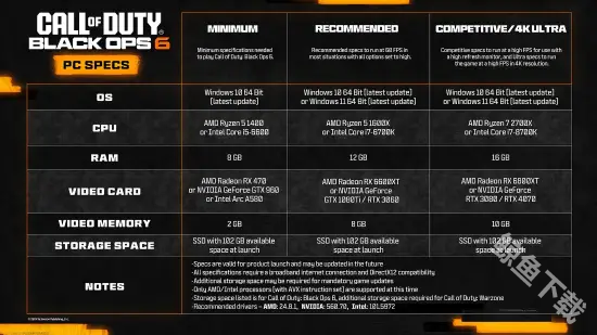 动视公布《使命召唤21:黑色行动6》更详细的配置需求,显卡最低要求GTX 960,而4K全高画质需要RTX 4070显卡。