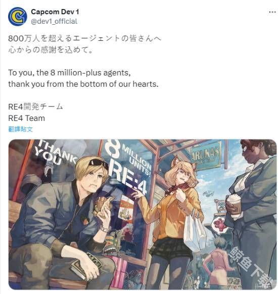 卡普空今日在X上发布新推文,宣布《生化危机4重制版》销量已经突破800万份!并配有一张卡通插图。官方对玩家非常感谢,感谢他们的支持与陪伴。