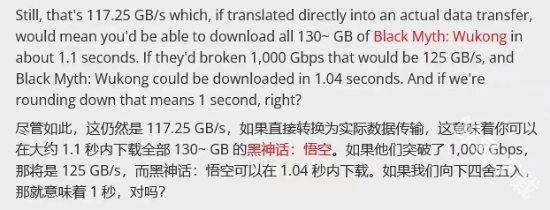 援引科技媒体pcgamer计算的实际下载速度,如果按照938Gbps速度计算,实际数据传输可以达到117.25GB/s,意味着用户下载《黑神话:悟空》游戏(约130GB)只需要1.1秒;如果未来6G网络突破1000Gbps,按照125GB/s速度计算,那么下载《黑神话:悟空》游戏只需要1.04秒。