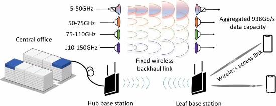研究人员展示了一种超宽145GHz带宽的无线传输技术,通过空中传输正交频分复用(OFDM)信号,覆盖5–150GHz频率范围。