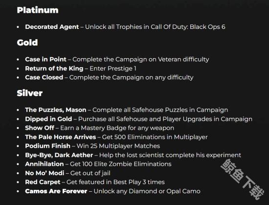 《使命召唤21:黑色行动6》全平台预载现已上线。根据外媒Insider Gaming的消息称,目前本作的成就系统现已公开,共有45个奖杯供玩家收集。