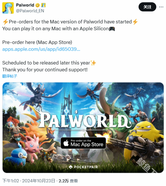 近日,Pocket Pair宣布Mac版《幻兽帕鲁(Palworld)》将于2024年年底发售,价格暂未公布,预购将逐步开始。