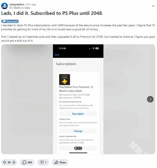 日前,有玩家在Reddit论坛发帖,晒出了自己订阅PlayStation Plus会员的截图,说道:“由于过去几年价格的大幅上涨,我决定一次性购买PlayStation Plus会员服务,直到2048年。我想我余生大部分时间都会玩游戏,所以这样能省下不少钱。我先是买了很多一档会员,然后花199美元全部升级成了三档会员。就想分享一下,我想你们会对此感兴趣的。”