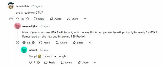 帖子随即引发玩家热议,有玩家对帖主的举动表示吃惊,说道:“我以为我订到2030年就够疯狂的了。.”“看来你已经准备好玩《GTA7》了。”也有玩家对此表示不解:“如果那时候服务器挂掉怎么办?如果到那时你已经不在人世了怎么办?”