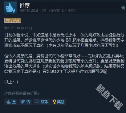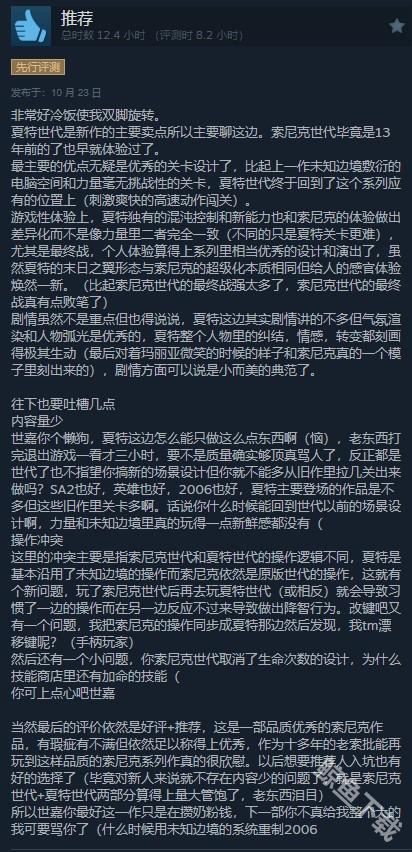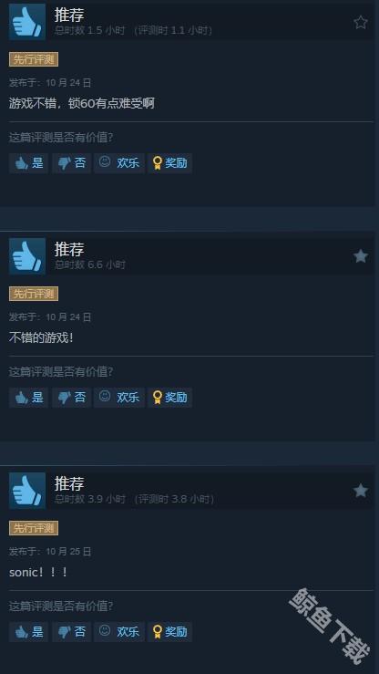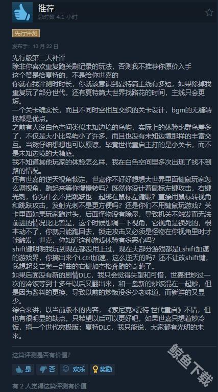 给出好评的玩家表示,《索尼克×夏特 世代重启》最主要的优点就是关卡设计,剧情与配乐等也比较不错,但也有部分缺点,例如内容量少、操作冲突等。