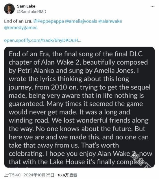 这一真挚的消息引发了粉丝热烈回应。许多评论感慨山姆·雷克带领玩家经历的这一历程,也有粉丝表示期待未来《心灵杀手》系列的新发展。