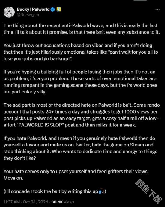 针对近日的反《幻兽帕鲁》浪潮,社区经理Bucky公开发文,表示这种过度情绪化的做法十分愚蠢。