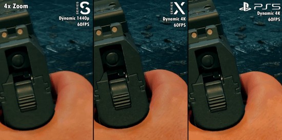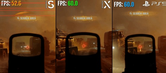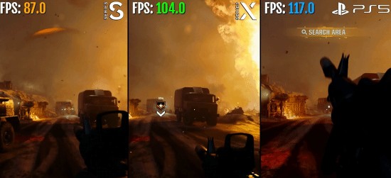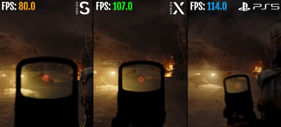 总结:质量模式下(XSS为2K,另外两个是4K),三款主机均有轻微掉帧情况,由场景复杂度决定。而在120帧的性能模式下,配置较低的XSS表现最差,能掉到70-80帧,甚至缺失很多特效与图形细节。从结果来看,XSX的表现优于XSS,但在帧数稳定性和运行效果方面稍微低于PS5。