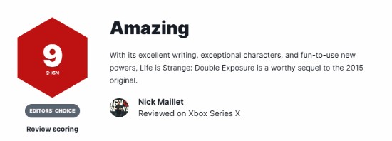 今日,IGN给SE新作《奇异人生:双重曝光》打出9分的评价,测评者认为,凭借出色的文笔、角色设计以及有趣的新能力,游戏是《奇异人生1》后值得玩家去体验的续作。