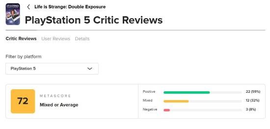 SE发行、Deck Nine制作的《奇异人生》系列新作《奇异人生:双重曝光》媒体评分解禁,目前本作在M站收录37个PS5版媒体评测,媒体均分为72分。Xbox版媒体评测收录13个,媒体均分73分;PC版收录12个,媒体均分75。