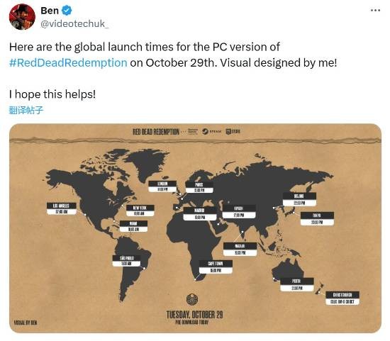 《荒野大镖客:救赎》PC版将在今日晚些时候正式发售,推主@videotechuk_自制了一张全球解锁时间图,本作在Steam国区将于北京时间10月29日晚上10点正式解锁。游戏支持简体中文界面、字幕,售价249元。