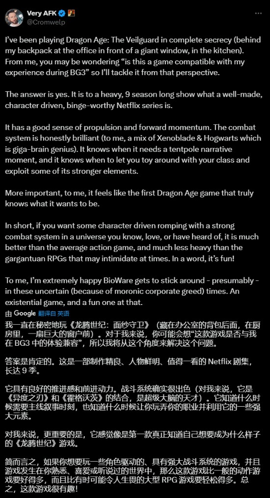 在推文中他提到:“我一直在秘密地玩《龙腾世纪4》,它就像一部制作精良、人物塑造鲜明的网飞剧集一样。本作的战斗系统确实很出色,对我来说就像《异度之刃》和《霍格沃兹之遗》的结合,真是天才的想法。”
