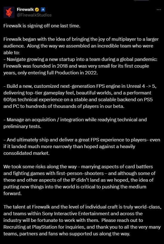“Firewalk的人才和个人水平确实是世界一流的,索尼互动娱乐和整个行业的团队都很庆幸能与他们合作。如有任何疑问,请联系PlayStation的招聘部门,感谢所有支持我们的团队、合作伙伴和粉丝。”