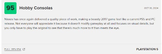 外媒Hobby Consolas给予了本作95分的高分,认为Nixxes再次推出了一款优质作品,让这款17年发售的游戏变得像在今年发售的一样。它完全没有修改游戏玩法,而是专注于提升游戏画质,但只要你玩过原版,就会发现它的魅力远不止于此。