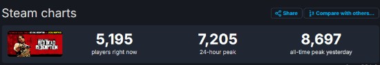 《荒野大镖客:救赎》移植版现已登陆PC平台。据Steamdb数据显示,截止发稿,游戏在该平台同时在线峰值人数达到8697人。