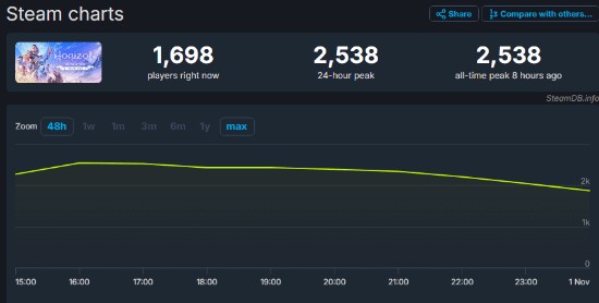 游戏目前的热度表现也较为一般,截止发稿,在Steam同时在线峰值人数达到2538人。作为比较,《西之绝境完整版》峰值人数40462人。