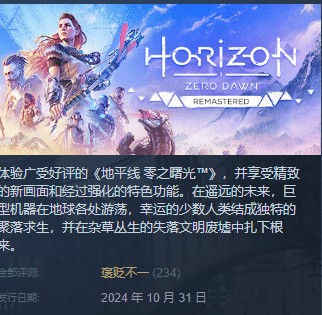 索尼《地平线:零之曙光复刻版》现已正式在Steam平台发售,截止发稿,本作收录了234条玩家评测,好评率61%(褒贬不一)。