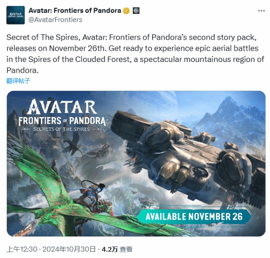育碧官宣,《阿凡达:潘多拉边境》第二款DLC“山峰探秘”将于11月26日正式上线。官方表示:“准备好在云雾林之塔体验史诗般的空战,云雾林之塔是潘多拉壮丽的山地景观。”