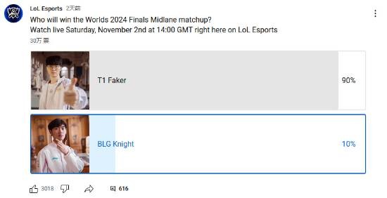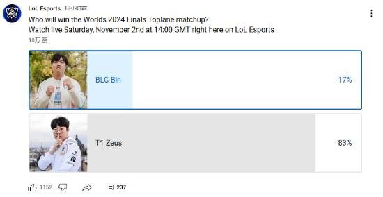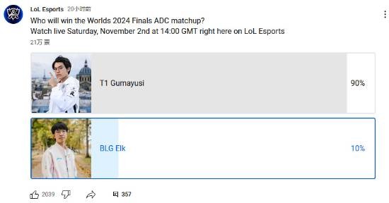 由此可见,在国外,T1的人气非常之高,在支持率方面有着压倒性的优势。希望BLG能顶住压力,拿下属于全华班的胜利!