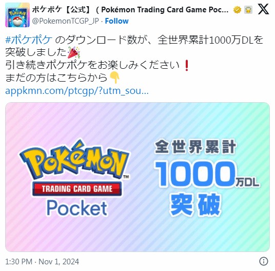 宝可梦公司宣布,手游《宝可梦TCG:口袋版》正式推出仅48小时,全球下载量就已超过1000万次。