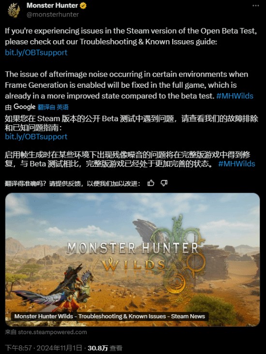 此外,《怪物猎人》官推表示,未来会针对公开测试中出现的各种问题进行进一步优化:“启用帧生成时在某些环境下出现残像噪音的问题将在完整版游戏中得到修复,与Beta测试相比,完整版游戏已经处于更加完善的状态。”