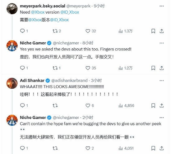 在评论区中,有网友表达了对XBOX版本的期待,留言道:“需要XBOX版本!”对此,Niche Gamer 回复称:“是的,我们也向开发者询问了这个问题。希望一切顺利!”