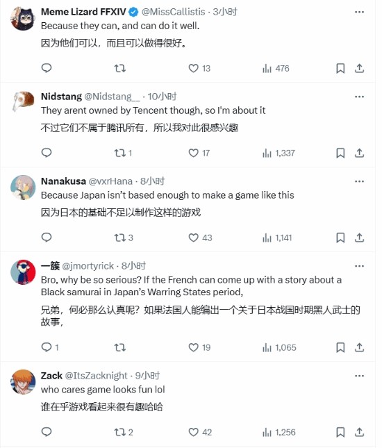 与此同时,也有网友提出疑问:“抱歉,但为什么一个中国开发团队要制作关于日本征服美国的游戏?”对此,评论区的回应十分热烈:“因为他们可以,并且做得很好。”“因为日本没有足够的勇气去做这样一款游戏。”“兄弟,为什么要这么敏感?如果法国人能想出一个关于日本战国时期黑武士的故事……”