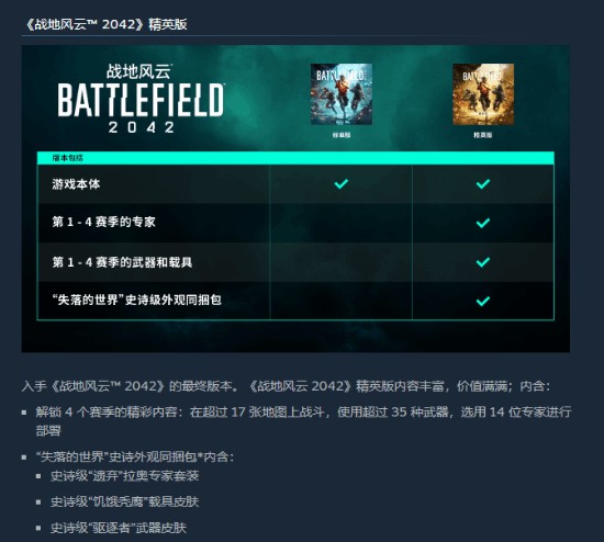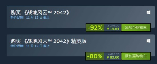 EA的《战地2042》现已在Steam平台开展特价促销活动,国区标准版仅需19.84元,《战地2042》精英版为83.6元,促销截止日期为11月12日,精英版包括游戏本体、第1-4赛季的专家、第1-4赛季的武器和载具以及“失落的世界”史诗级外观同捆包,感兴趣的玩家可以点击下方链接查看。