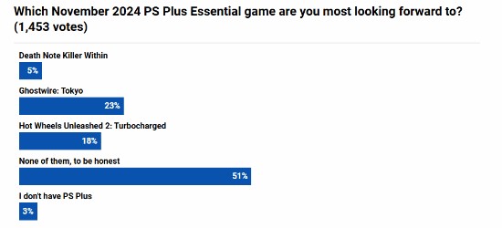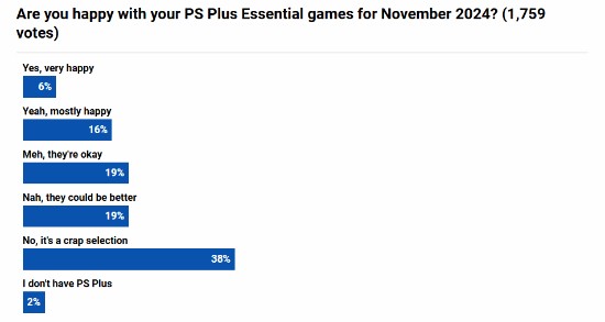 外媒Push Square发起了对11月会免游戏的满意度调查,截至发稿前共1759名玩家参与,调查结果显示,仅约6%的玩家对本月会免游戏非常满意,16%的玩家表示本月大部分会免游戏还不错,19%的玩家认为本月会免游戏还行且比较普通,19%的玩家认为本月会免游戏应该更好一些,38%的玩家则认为本月会免游戏相当差劲。