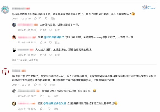 有网友表示:“小孩真是肉眼可见的越来越强了啊,越是大赛发挥越好真无敌了,并且上限也高得离谱,真的有森载那味了。”另有网友评论:“G2现在三核火力太猛了,感觉只有满状态的NAVI,五人不犯病的小蜜蜂,以及超常发挥的老鼠或像科隆SAW那样有针对性的新战术黑马队才有机会能赢,其他队正常打都没啥赢的机会,只能等G2自己犯病。”