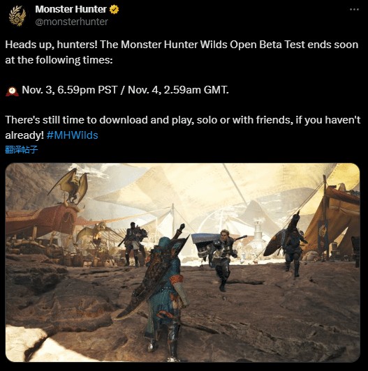 卡普空官推今日发文,提醒广大玩家《怪物猎人:荒野》公开测试即将于今日(11.4)上午11:00正式结束。