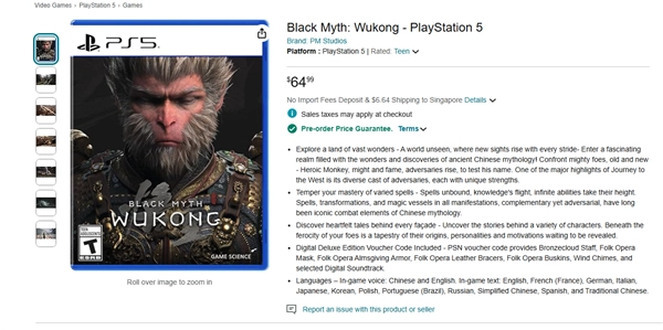 今日(11月5日),《黑神话:悟空》的PS5日版实体版从即日起开启预订,将于2024年1月30日在日本正式发售。根据亚马逊官方页面显示,本作日版实体版售价为7,981日元(约合人民币400元)。
