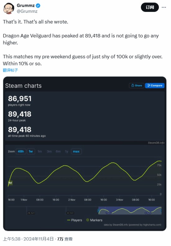 日前,前暴雪制作人@Grummz引用了这一数据发推说道:“就这样了,《龙腾世纪4:影障守护者》的Steam玩家峰值为89418人,不会再更高了。这与我周末前的预测基本一致,即略低于10万或略高于10万。误差在10%左右。”