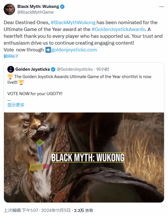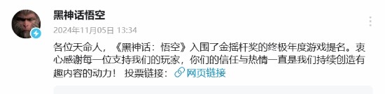 金摇杆奖日前公布了“终极年度游戏”奖项提名,包括《黑神话:悟空》等一系列游戏入围。11月5日,《黑神话:悟空》官方发推对此进行了庆祝,并公布了投票链接,感兴趣的玩家可以点击下方链接进入参与投票。