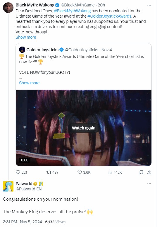 获得金摇杆年度游戏提名后,《黑神话:悟空》开始在各平台发文拉票。好兄弟《幻兽帕鲁》在评论区送上了祝贺:“恭喜你获得提名!所有的赞美都是美猴王应得的!”