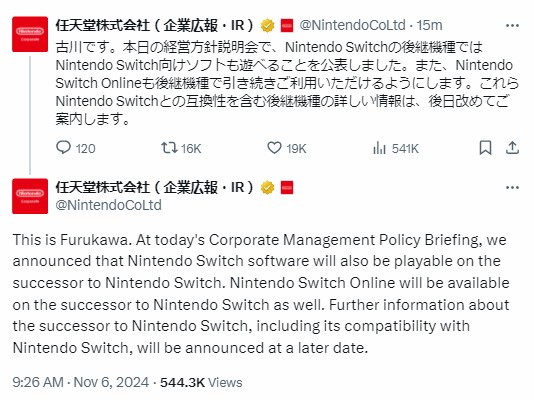 社长古川俊太郎在任天堂官推上发文宣布,Switch后继机种将支持向下兼容,可以运行Switch平台的软件。此外,NSO会员也可以继续使用。